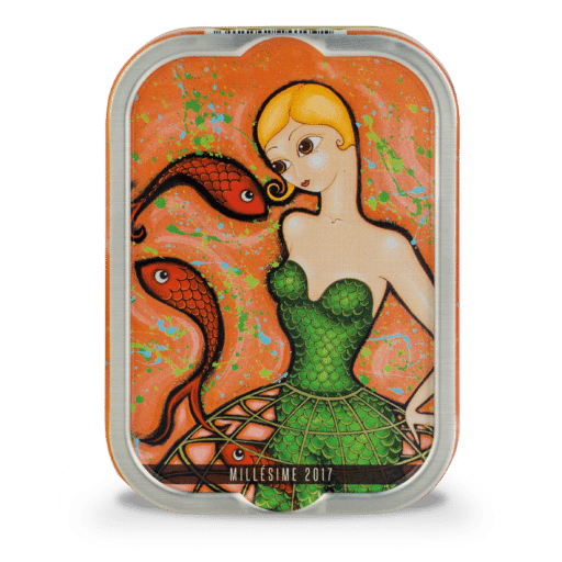 Cette boîte sublime abrite quatre à six sardines d’exception : en provenance des eaux de Saint-Gilles-Croix-de-Vie, les sardines de garde ont été préparées et mise en boîtes extra fraîches, à la main. Dans leur huile d’olive vierge extra, elles s’affinent pendant dix ans, se confisent patiemment, pour, au bout, révéler un arôme et un fondant fabuleux.