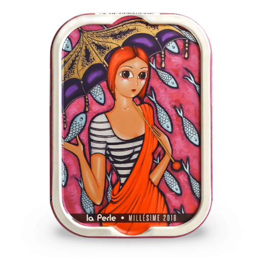 En 2018, l’artiste-peintre Coralie Joulin nous propose une nouvelle œuvre pour nos sardines millésimées. Cette année, notre égérie Mademoiselle Lulu sublime notre boîte de conserve grâce à des couleurs captivantes et féminines à la fois. Mais toujours dans une ambiance haute-couture, Mademoiselle Lulu inspire la grâce dans son sari indien et son ombrelle en dentelle.