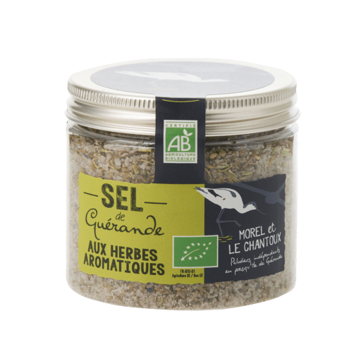 Sel de Guérande avec un mélange équilibré de thym, romarin, sarriette, marjolaine, origan vert, hysope et origan rouge.
